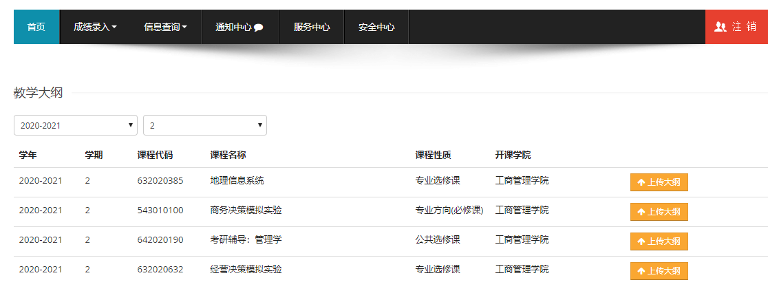 点击进入后,进入如下图所示界面,根据本学所授课程,点击“上传大纲”,