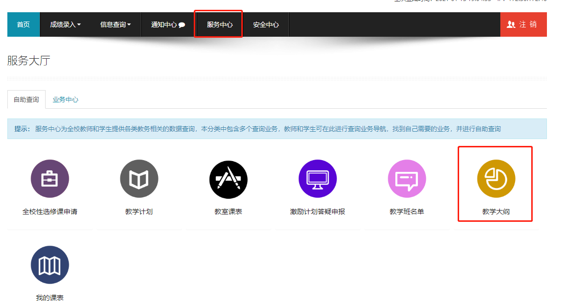 进入到新教务系统后,选择“服务中心”--“教学大纲”,如下图所示