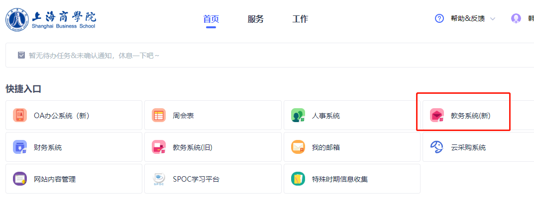 进入学校门户OA后,选择新教务系统,如下图所示: