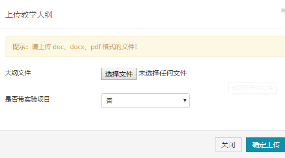 点击“上传大纲”界面如下,只能上传word或pdf格式的大纲。
