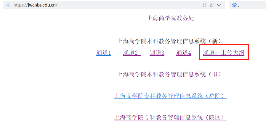 或直接在浏览器中输入网址 http://jwc.sbs.edu.cn,选择“通道:上传大纲”,如下图所示: