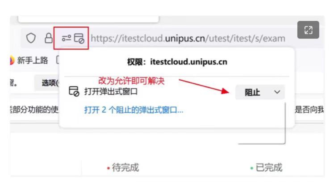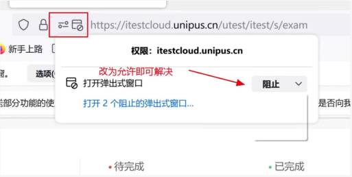 *如点击【进入考试】页面没反应或无法跳转,请考生注意考试界面是否被拦截,请检查浏览器的弹窗设置,点击【允许浏览器弹窗】即可;