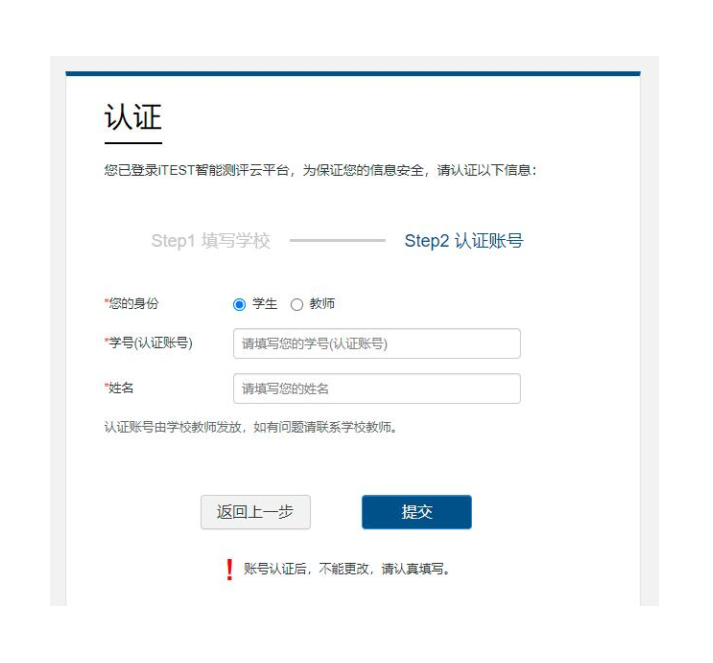 第三步:认证。点击【去认证】,进入选择学校的界面,按照提示填写学校名称。输入学号和姓名,点击【提交】,进入下一步。认证环节仅在首次登录时需要。