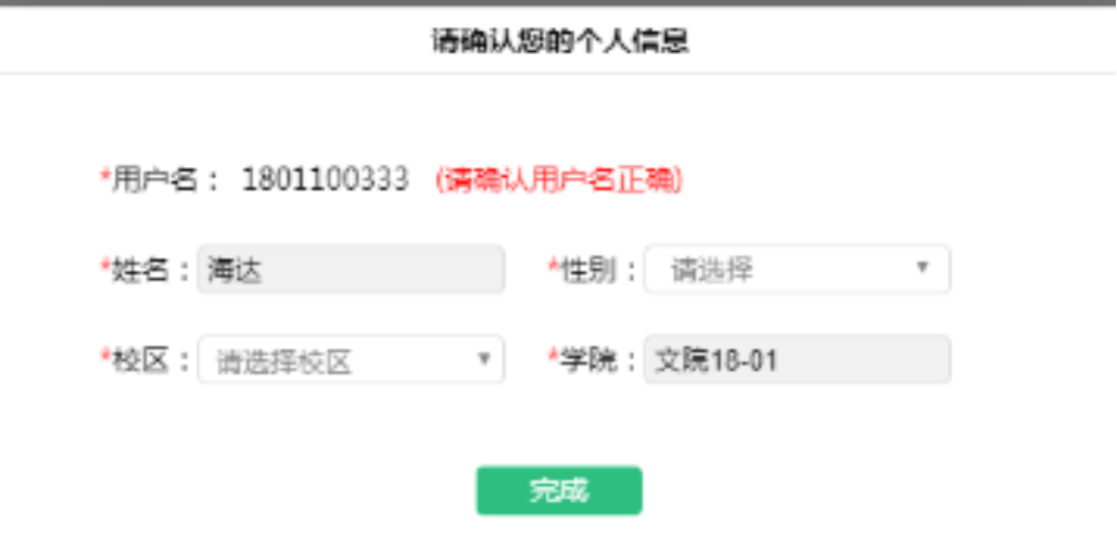 第四步:确认个人信息。请考生核对用户名、姓名、性别、校区、学院是否准确,点击【完成】。