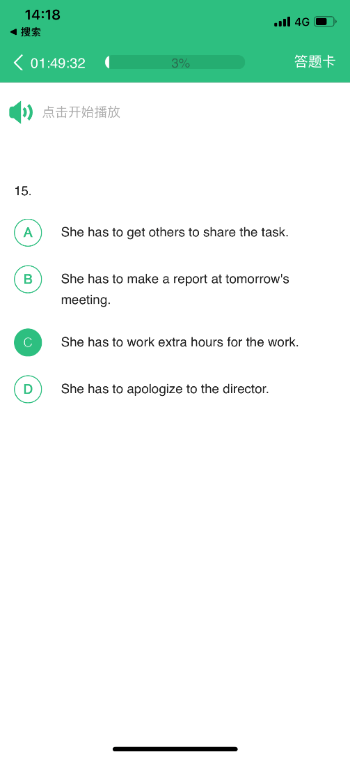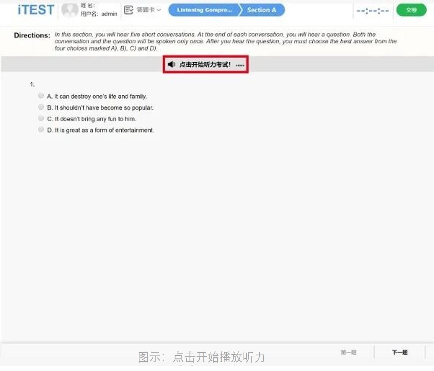 1. 听力题按Section播放,需要学生点击【点击开始听力考试】后,系统才会进行播放,Section内的小题系统自动跳转,播放的过程中无法暂停,已播放的听力音频不可重复收听。请学生认真完成听力考试。