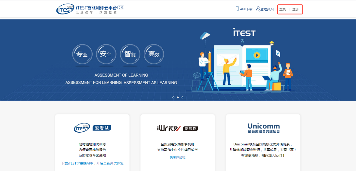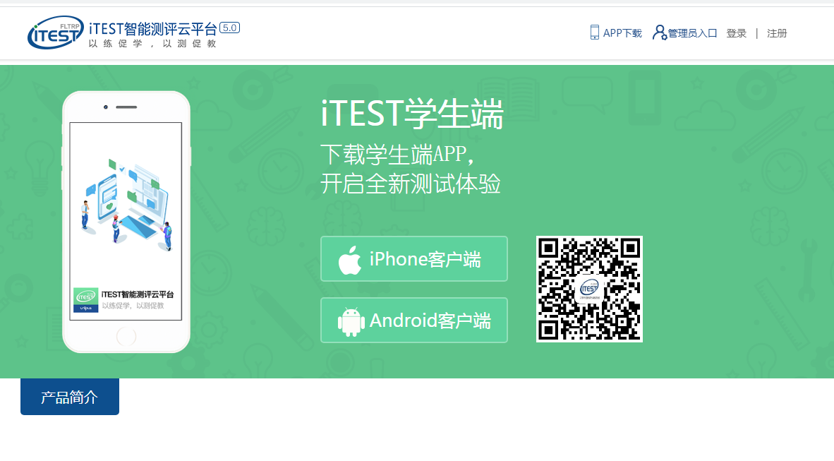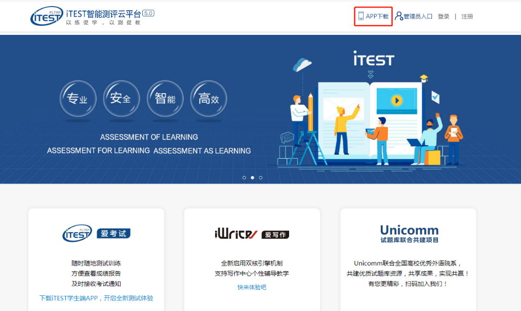 第一步:下载【iTEST爱考试app】。请考生至https://itestcloud.unipus.cn,点击【app下载】。
