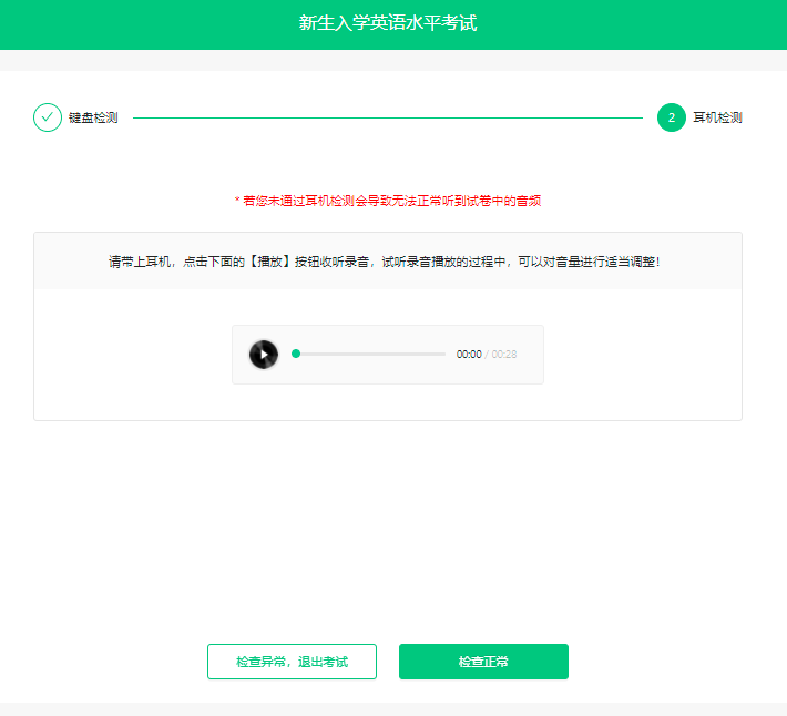 *考前30分钟可点击【进入考试】,对设备(耳机、键盘等)进行检测,并提前加载试卷,等待考试开始。设备检测与加载试卷的时间不会计入考试时长中;