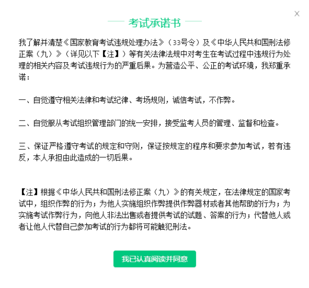 第六步:阅读考试承诺书。阅读完成后,点击【我已认真阅读并同意】。如点击后,无法进入考试,请检查浏览器的弹窗设置,点击【允许浏览器弹窗】即可;