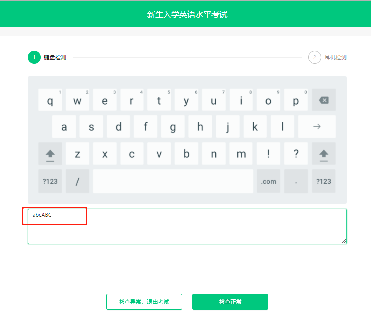 第八步:键盘检测。请考生务必切换为英文半角输入法,否则作文字数将会显示为0。(无需依次键入字母,输入单词测试无误即可)