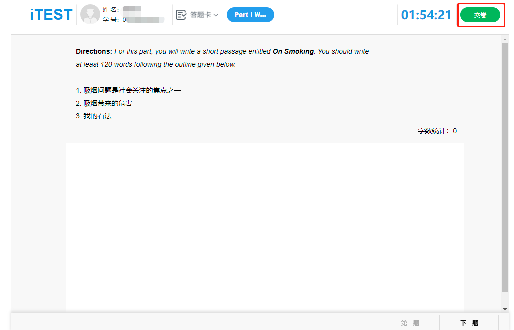 考试设备:请考生尽量使用电脑作答,如无电脑可用手机作答,Pad端暂不支持考试。使用手机作答的考生请至https://itestcloud.unipus.cn下载官方app 【iTEST爱考试】。