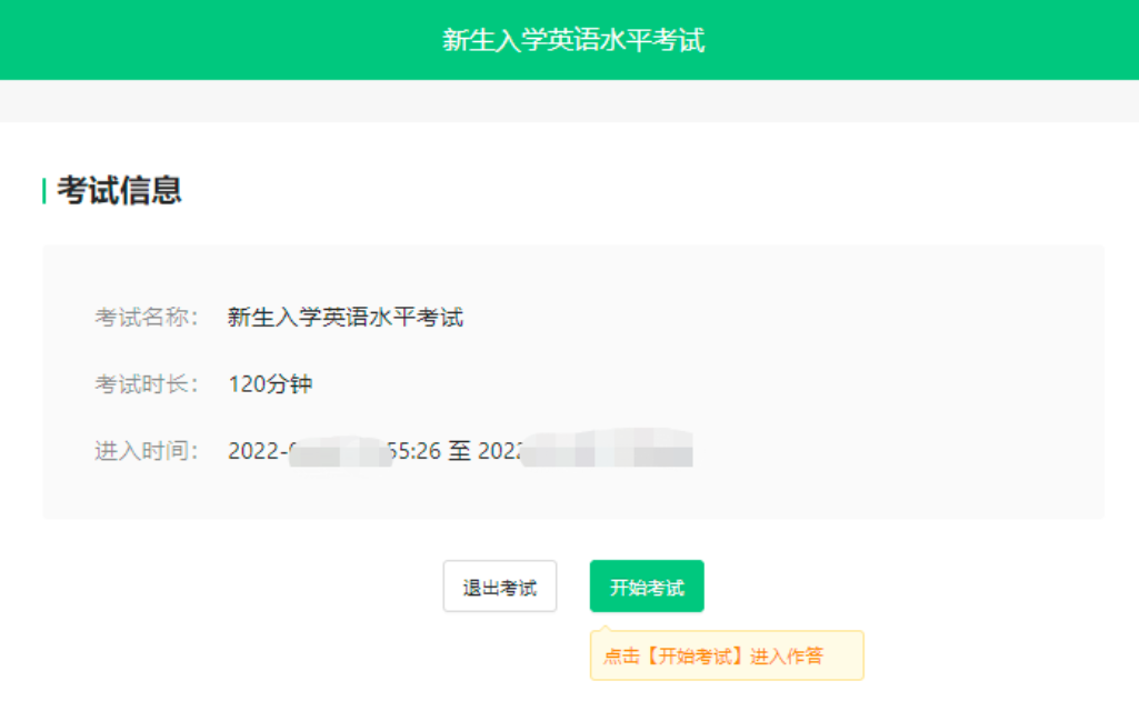 第五步:考试。进入系统后,在【考试】下找到【2025级大学英语新生分班考试】的考试。请学生在规定的考试时间范围内点击【进入考试】。(下图是示例)