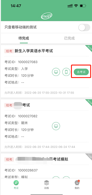 第四步:考试。从底部导航进入考试页面,在待完成的考试中,点击【去考试】,系统自动加载试卷,加载完成后,点击【进入测试】。