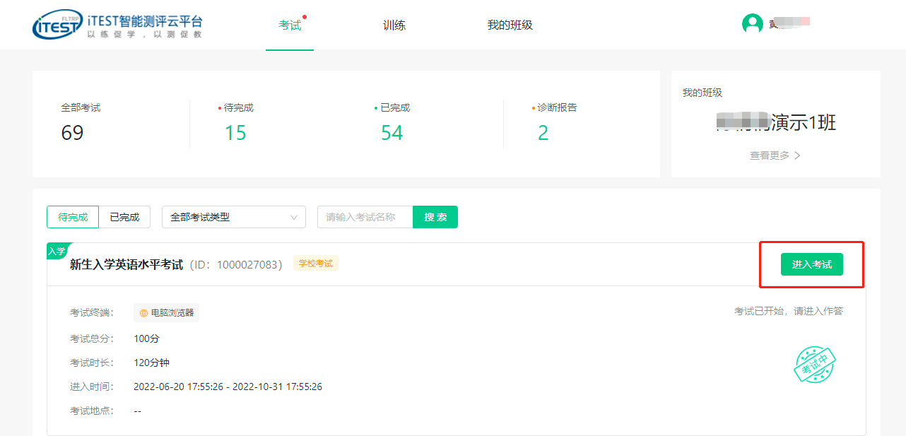 学生在考试阶段的任一时间登录iTEST平台完成2025级大学英语新生分班考试即可。