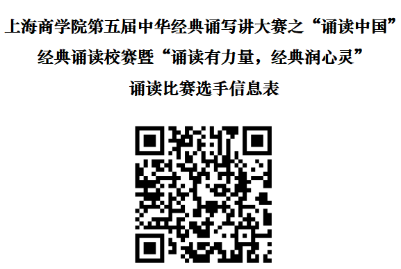 2.填写选手信息表(见下方二维码),与初赛视频一并,于4月14日前发送至教务处(语委办)邮箱:sbsyywz@126.com 邮件请以“诵读大赛+主要选手姓名+组别”形式命名。