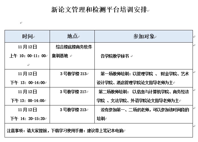 为便于师生更加便捷高效开展论文写作、指导、检测查重工作,教务处拟在2020届毕业生当中,试用新的毕业设计(论文)管理和检测平台。该平台具有论文过程管理、论文检测查重等主要功能,由于新的平台上线,需要对毕业论文工作的秘书和论文指导老师分批开展培训工作,请论文指导老师,协调好时间,及时参加。培训通知如下: