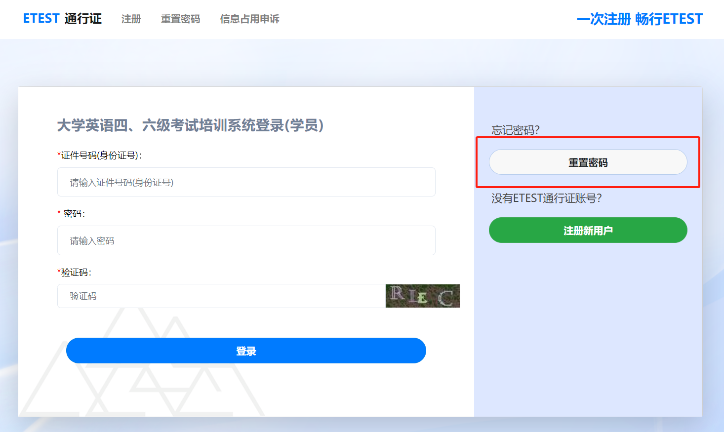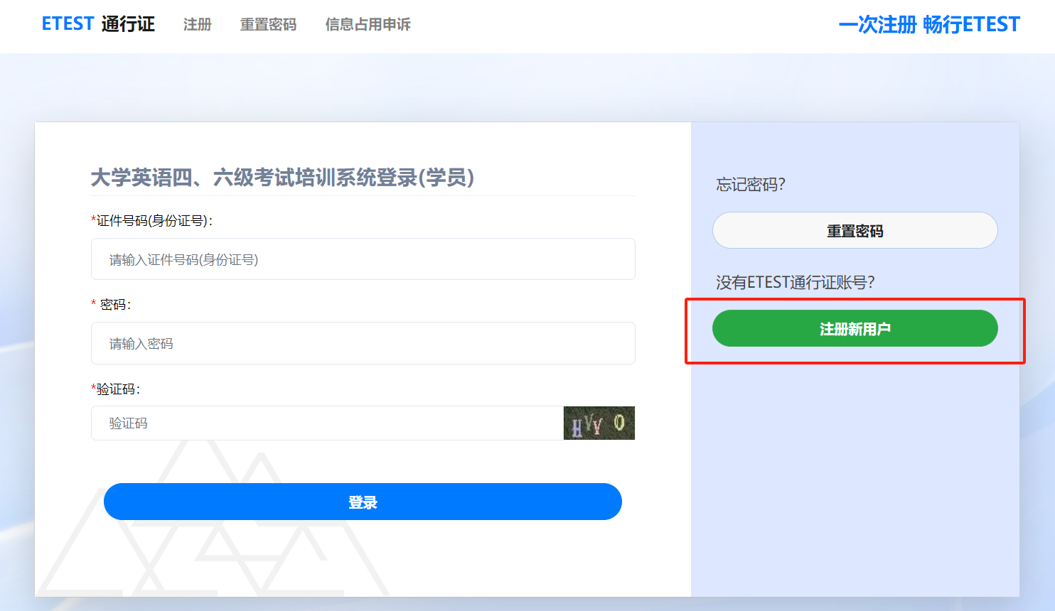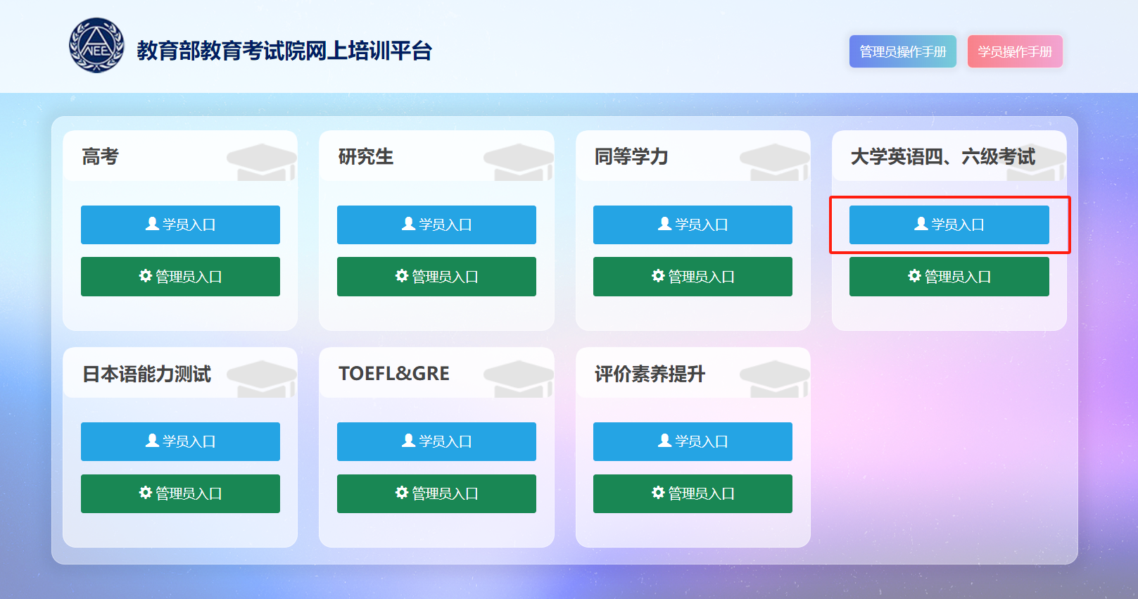 (一)从培训系统首页“大学英语四、六级考试”项目的“学员入口”进入登录页面。