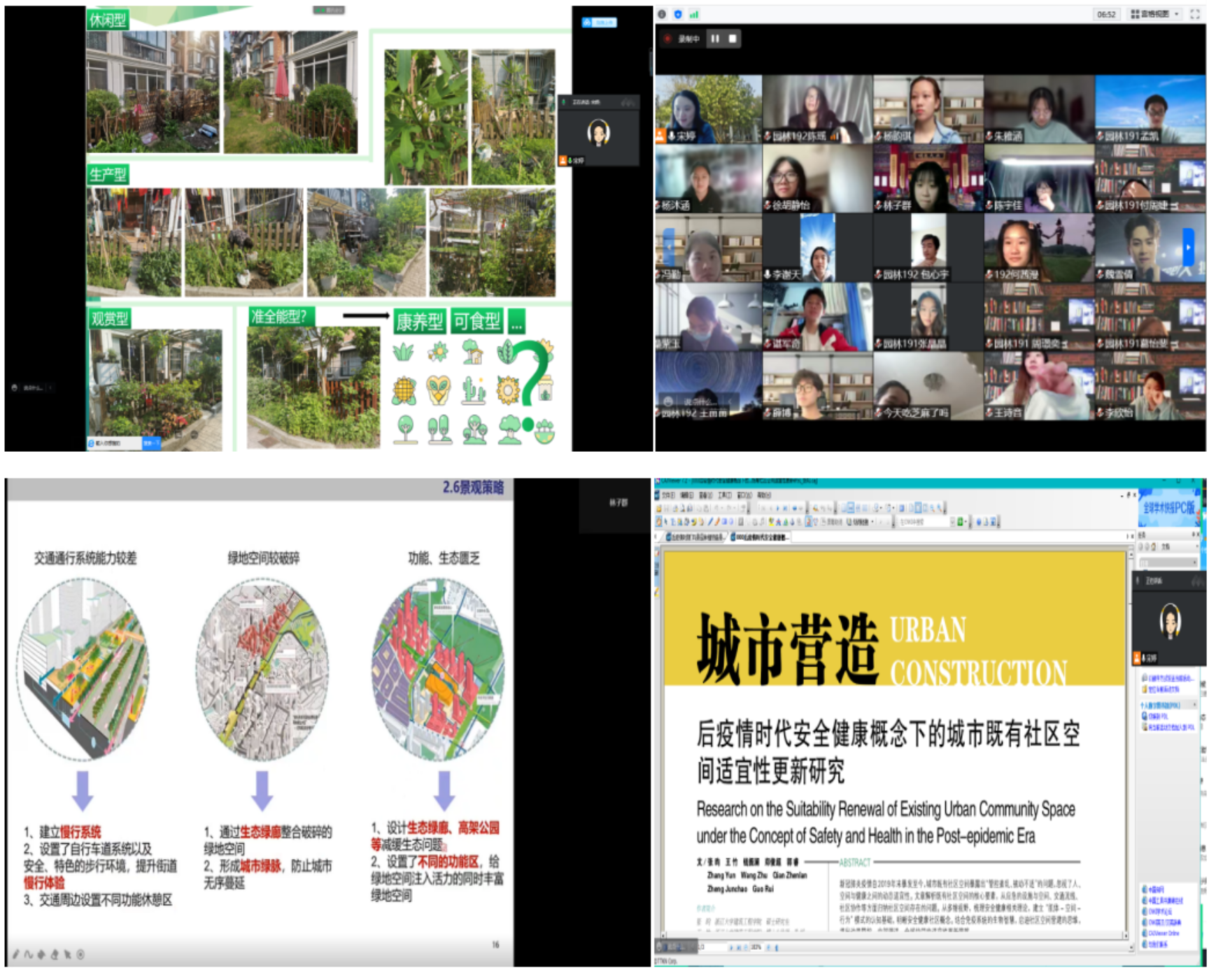 园林景观设计专业是学校新农科建设重点孵化专业。近年地震、暴雨、新冠肺炎等灾害频发,抗灾防疫、园林疗愈与课程建设相融合成为园林类课程加强内涵建设的重点。园林专业教师宋婷采用SPOC平台、课程微信群和腾讯会议相结合的方式开展《城市绿地系统规划》课程线上教学。在SPOC平台发布课件资料、课后练习、课程作业等;运用微信群实现课程答疑与实时沟通;通过腾讯会议直播授课,一方面,引入景观心理学帮助学生调整不适情绪,一方面有意识得将专业知识和疫情防控大背景相结合,不断更新教学案例,开展课程思政实践,通过分析绿地的抗疫作用与局限,引导学生向健康中国、后疫情城市建设和专业发展等方面进行深层思考。