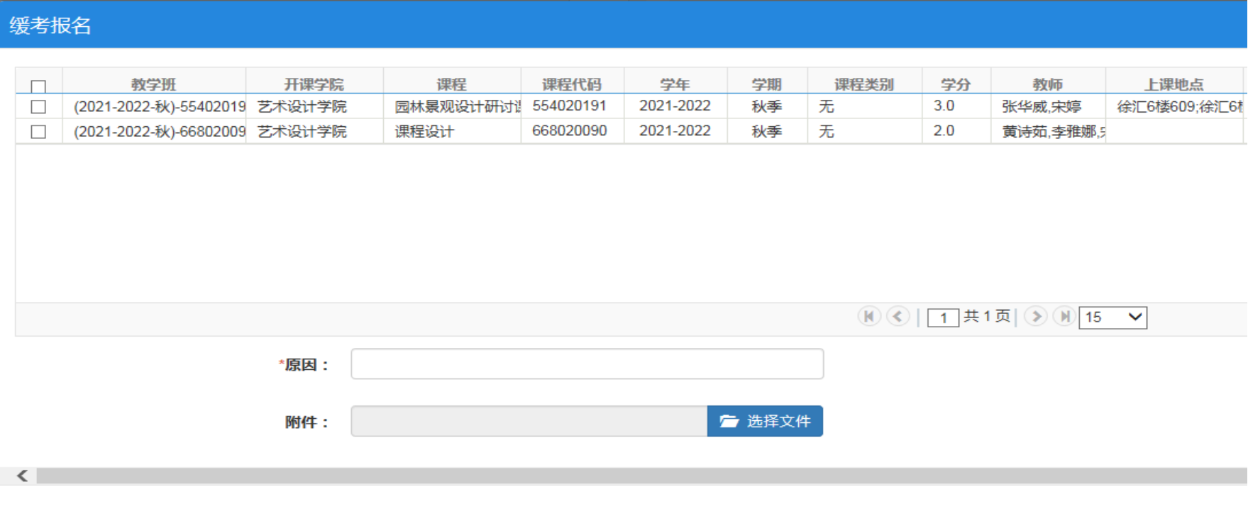 勾选中需办理缓考的课程后,填写原因,并提交附件。